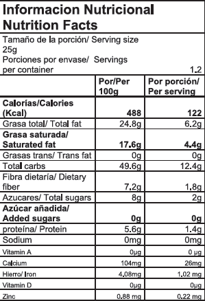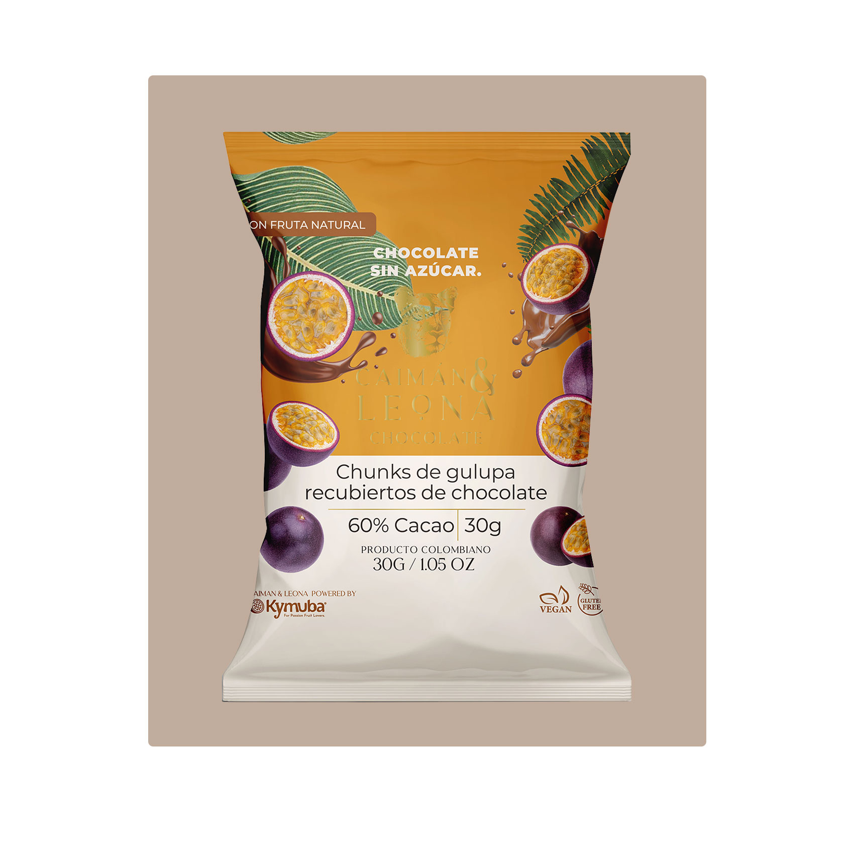Ingredientes: masa de cacao, alulosa, manteca de cacao y gulupa.