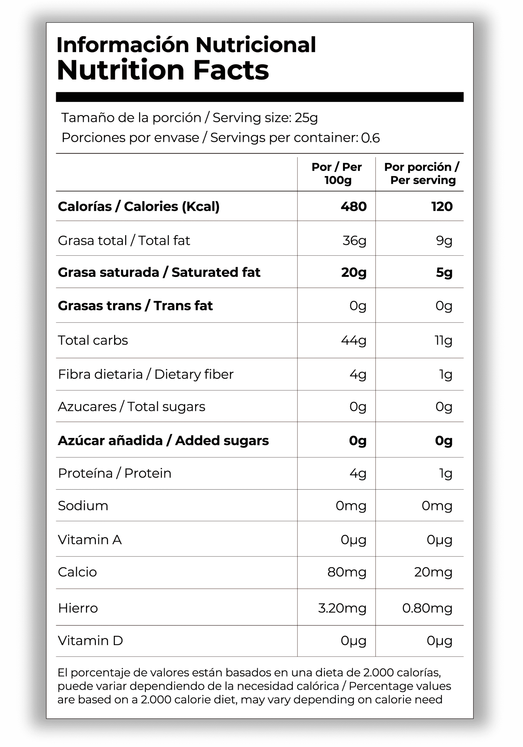 Beneficios: sin azúcar añadida, libre de gluten, vegano, ingredientes naturales.