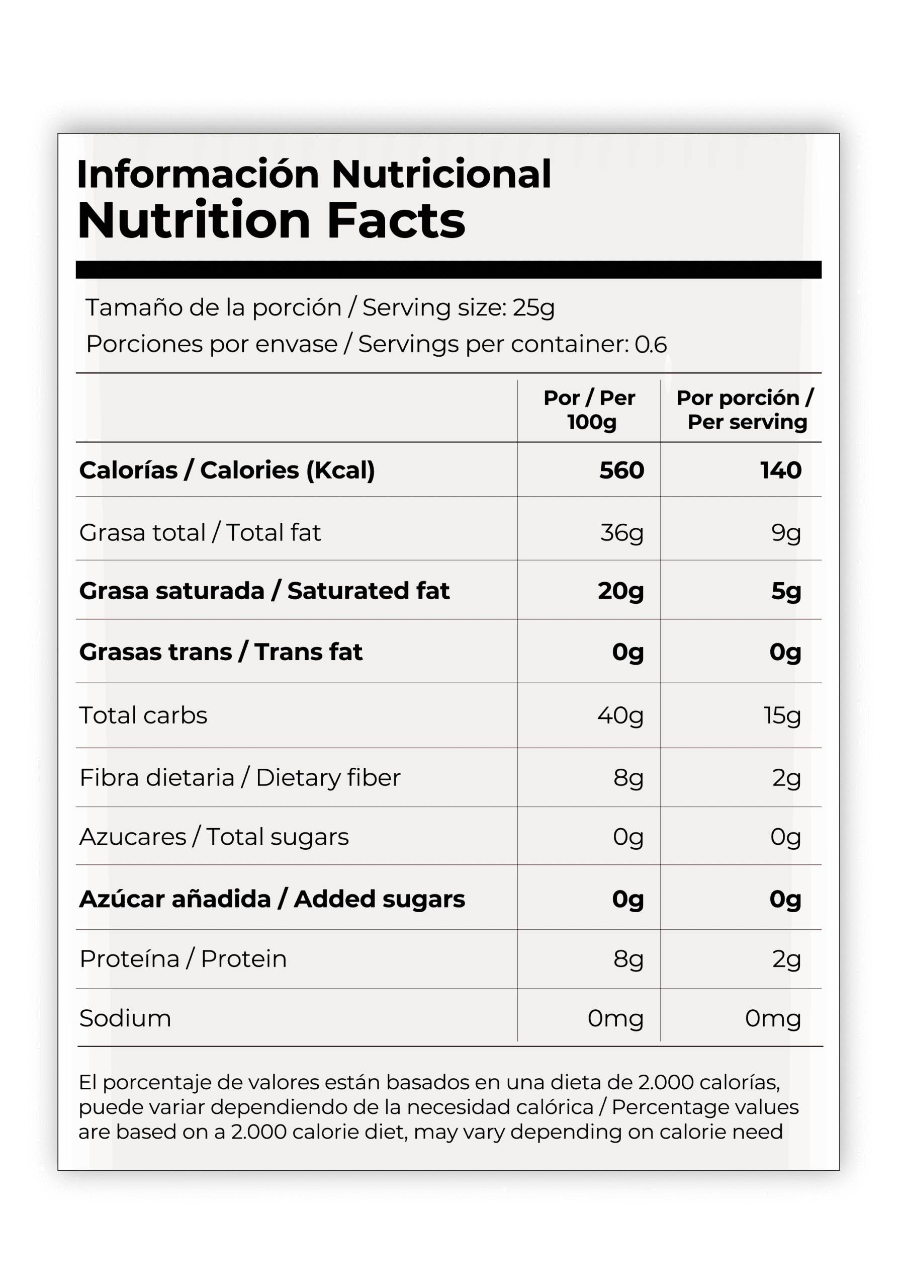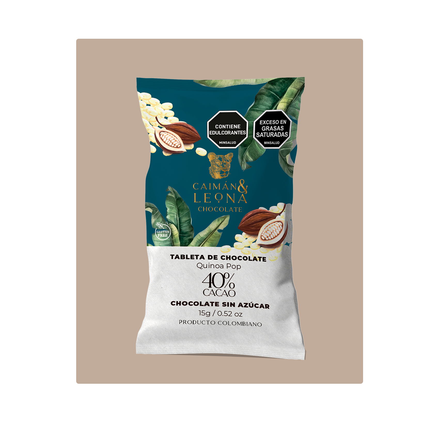 Ingredientes: masa de cacao orgánica, alulosa, manteca de cacao y quinoa.